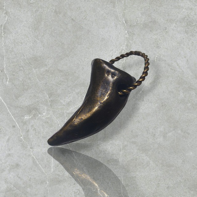 大型猛獣の牙をモチーフにしたトップになります。 素材は真鍮を使い、重量感あるデザインになり、表面はいぶし加工を施しアンティーク仕上げにしております。 メタルチェーン、又は革紐などとも相性抜群です。 THEFTらしい細部まで拘ったデザイン仕様になります。 素材 真鍮 全長 本体のみ3.1㎝(マルカン含まず)