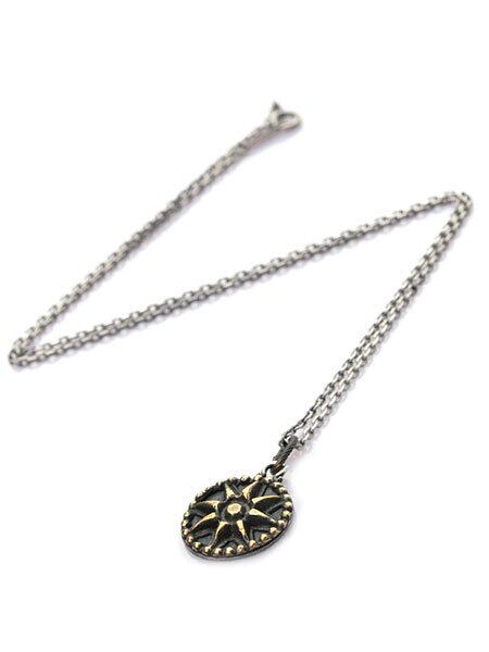 太陽をモチーフにデザインネックレスになります。土台はシルバー製で表部分の太陽モチーフは真鍮製になりバランスよく上品にデザインされております。表面はアンティーク加工し落ち着いた雰囲気です。