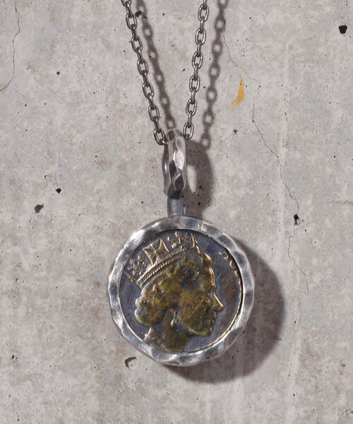 丸い土台には叩き加工されエリザベスがデザインされた真鍮を合わせたネックレスです。