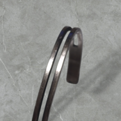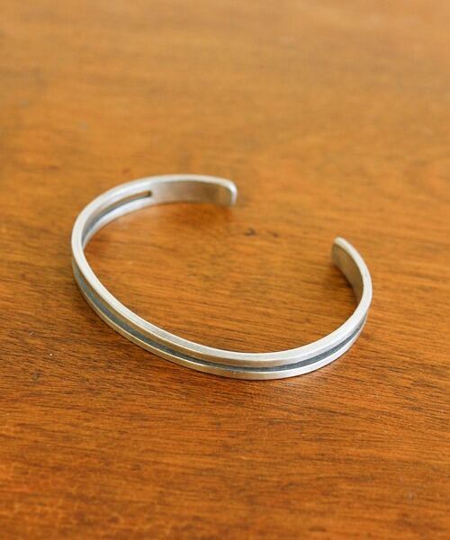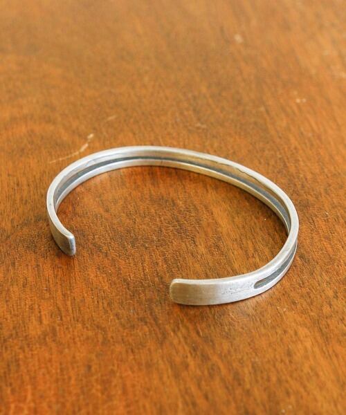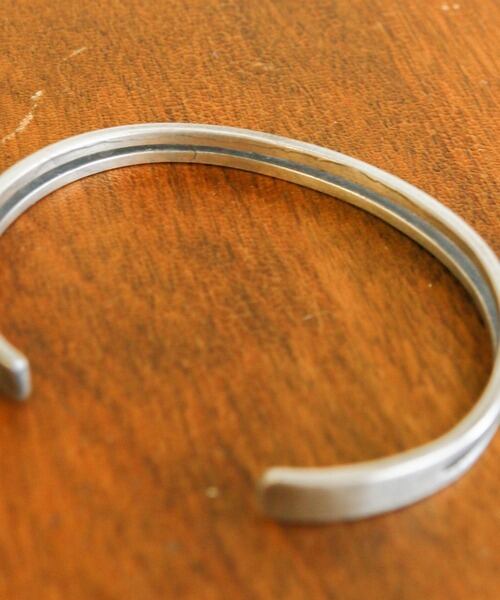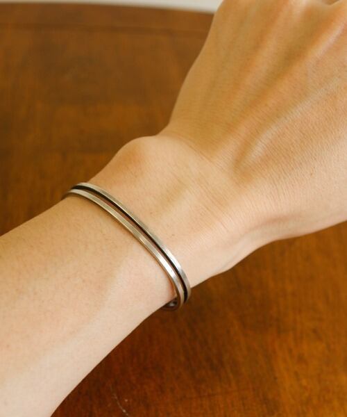 シンプルなバングルですが身に着けると2連バングルに見えるようにデザインされてます。サイズはフリーになり広げたり閉めて頂ければサイズ調整も可能です。表面はいぶし加工をし落ち着いた雰囲気になり、男女ともにおすすめです。ギフトでもぴったりな素敵なバングルです。